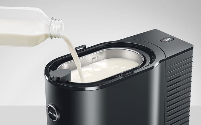 Kapaciteten hos mjölkbehållaren i rostfritt stål om 2.5 l möjliggör ett stort antal beredningar av kaffespecialiteter med mjölk. Den trådlösa* kommunikationen mellan Cool Control och kaffemaskinen samt den integrerade nivåindikatorn ser till att du alltid kommer ihåg att fylla på mjölk i tid. Dessutom har den en låsmekanism som förhindrar obehörig åtkomst. Cool Control är därmed ett perfekt komplement till professionella apparater ur X- och GIGA Line från JURA.